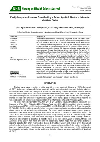 Grace Agustin, Pakilaran and Hanny, Rasni and Kholid Rosyidi Muhammad, Nur and Dodi, Wijaya (2022) Family support on exclusive breastfeeding in babies aged 0-6 months in Indonesia: Literature review. Nursing and Health Sciences Journal, 2 (2): 3. pp. 104-107. ISSN 2798-5059