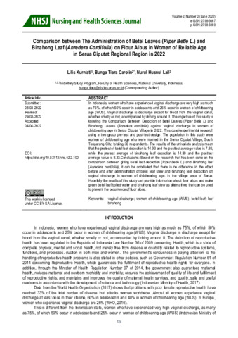 Lilis, Kurniati and Bunga Tiara, Carolin and Nurul Husnul, Lail (2022) Comparison between the administration of Betel leaves (Piper betle L.) and Binahong beaf (Anredera cordifolia) on Flour albus in women of reliable age in Serua Ciputat Regional Region in 2022. Nursing and Health Sciences Journal, 2 (2): 6. pp. 124-129. ISSN 2798-5059