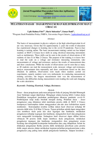 Dasar-dasar pengukuran pada mata pelajaran fisika di jenjang Sekolah Menengah Atas/ Sederajat sangat diperlukan. Mengingat selama kurang lebih 2 tahun dunia Pendidikan mengalami perubahan pembelajaran dikarena pandemic covid-19.Pembelajaran tatap muka berubah menjadi daring. Pelatihan dasar – dasar pengukuran yang dilakukan telah membantu peserta didik di MAN 2 Ciracas mempunyai keterampilan dalam menggunakan alat-alat ukur kelisktrikan seperti multimeter. Keterampilan tersebut terlihat dalam hasil observasi terhadap 40 speserta didik kelas X di Man 2 Ciracas. Tujuan pelatihan adalah dapat mengetahui cara membaca skala pada alat ukur tegangan dan hambatan, melakukanpengukuran terhadap tegangan dan hambatan, menganalisis hasil data pengukuran serta mengambil kesimpulan. Sedangkan hasil observasi dapat dilihat bahwa sebanyak 40 peserta didik dapat membaca skala pengukuran, melakukanpengukuran tegangan dan hambatan, menganalisis data pengukuran secara berulang dan mengambil kesimpulan berdasarkan data yang didapatkan. Selain itu dilakukan pengamatan Ketika peserta didik melakukan percobaan yaitu peserta didik sangat antusias dalam melakukan kegiatan pelatihan pengukuran,lama waktu pengukuran yang paling lama adalah pengukuran hambatan, Adapun kesulitankesulitan selama melakukan pengukuran adalah membaca skala dan merubah perhitungan skala.