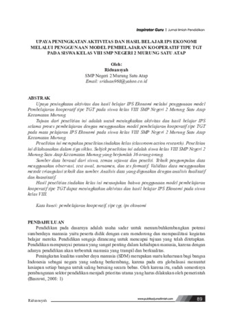Upaya peningkatan aktivitas dan hasil belajar IPS Ekonomi melalui penggunaan model Pembelajaran kooperatif tipe TGT pada siswa kelas VIII SMP Negeri 2 Murung Satu Atap Kecamatan Murung. Tujuan dari penelitian ini adalah untuk meningkatkan aktivitas dan hasil belajar IPS selama proses pembelajaran dengan menggunakan model pembelajaran kooperatif tipe TGT pada mata pelajaran IPS Ekonomi pada siswa kelas VIII SMP Negeri 2 Murung Satu Atap Kecamatan Murung. Penelitian ini merupakan penelitian tindakan kelas (classroom action research). Penelitian ini dilaksanakan dalam tiga siklus. Subjek penelitian ini adalah siswa kelas VIII SMP Negeri 2 Murung Satu Atap Kecamatan Murung yang berjumlah 36 orang orang. Sumber data berasal dari siswa, teman sejawat dan peneliti. Teknik pengumpulan data menggunakan observasi, test awal, turnamen, dan tes formatif. Validitas data menggunakan metode triangulasi teknik dan sumber. Analisis data yang digunakan dengan analisis kualitatif dan kuantitatif. Hasil penelitian tindakan kelas ini menunjukan bahwa penggunaan model pembelajaran kooperatif tipe TGT dapat meningkatkan aktivitas dan hasil belajar IPS Ekonomi pada siswa kelas VIII