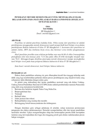Tuti, Mitilda (2023) Penerapan metode demonstrasi untuk meningkatkan hasil belajar siswa pada mata pelajaran Bahasa Indonesia di Kelas IV SD Mangkalisoi 1. Inspirator Guru, 5 (2): 11. pp. 97-104. ISSN 2654-2536