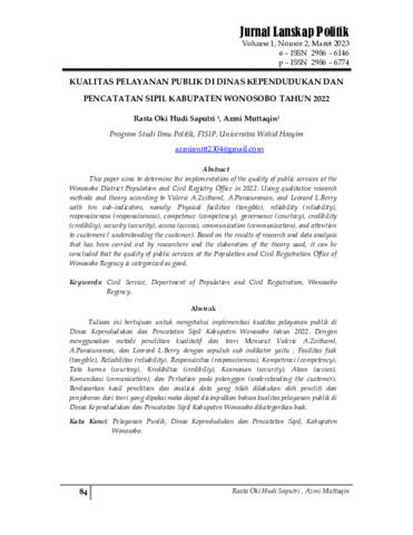Rasta, Oki Hudi Saputri and Azmi, Muttaqin (2023) Kualitas pelayanan publik di Dinas Kependudukan dan Pencatatan Sipil Kabupaten Wonosobo tahun 2022. Jurnal Lanskap Politik, 1 (2): 6. pp. 84-106. ISSN 2986-6774