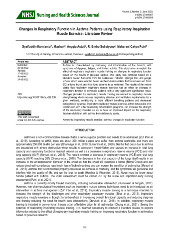 Syaifuddin, Kurnianto and Mashuri, Mashuri and Anggia, Astuti and R. Endro, Sulistyono and Maharani Cahyo, Putri (2022) Changes in respiratory function in asthma patients using respiratory inspiration muscle exercise: Literature review. Nursing and Health Sciences Journal, 2 (2): 14. pp. 179-182. ISSN 2798-5059