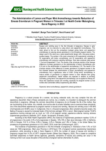 Hamidah, Hamidah and Bunga Tiara, Carolin and Nurul Husnul, Lail (2022) The administration of lemon and paper mint aromatherapy towards reduction of Emesis gravidarum in pregnant women in Trimester I at Health Center Malangbong, Garut Regency in 2022. Nursing and Health Sciences Journal, 2 (2): 15. pp. 183-189. ISSN 2798-5059