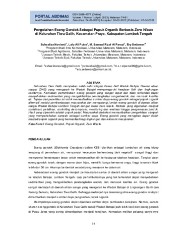 Suhasliza Novianti and Lalu Ali Putra and M. Samsul Rizal Al Farozi and Ery Setiawan (2023) Pengolahan eceng gondok sebagai pupuk organik berbasis zero waste di Kelurahan Tiwu Galih, Kecamatan Praya, Kabupaten Lombok Tengah. PORTAL ABDIMAS: Jurnal Pengabdian Kepada Masyarakat, 1 (1): 10. pp. 74-81. ISSN 2986-4577
