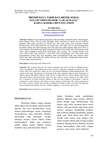 Ira, Mayasari (2020) Prinsip daya tarik dan kritik sosial dalam video humor "Gak Sengaja" karya komika Bintang Emon. Wacana: Jurnal Bahasa, Seni, dan Pengajaran, 4 (1): 7. pp. 63-72. ISSN 2085-2053