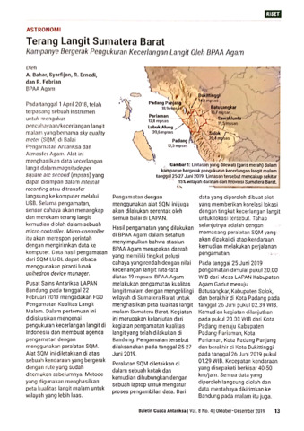 Afrizal, Bahar and Syafrijon, Syafrijon and Ramza, Ernedi and R, Febrian (2019) Terang langit Sumatera Barat: Kampanye bergerak pengukuran kecerlangan langit oleh BPAA Agam. Buletin Cuaca Antariksa, 8 (4): 7. pp. 13-14. ISSN 2303-2707