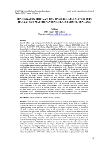 Banyak faktor yang menghambat keberhasilan pengajaran berbalas pantun diantaranya adalah data hasil penilaian pembelajaran berbalas pantun Tahun pelajaran 2019-2020 kelas VII Semester 2 di SMPN 42 Surabaya didapat kenyataan 78 % siswa tidak dapat berbalas pantun dengan baik. Apabila diberikan tugas untuk melaksanakan kegiatan berbalas pantun mereka sulit mengungkapkan gagasanya secara lisan secara berkesinambungan. Untuk itu seorang guru dituntut menggunakan pendekatan, metode dan teknik yang dapat meningkatkan motivasi dan hasil belajar siswa. Tujuan penelitian ini untuk memberikan gambaran tentang pelaksanaan pembelajaran model Tundang dalam pembelajaran berbalas pantun yang dapat meningkatkan motivasi dan hasil belajar siswa. Penelitian ini menggunakan penelitian tindakan (action research) sebanyak dua putaran. Dari penilaian hasil belajar dan motivasi siswa mencapai rata-rata masing-masing pada kelas eksperimen 74,31 (VII A) sedangkan pada kelas yang tidak menggunakan model tundang penilaian hasil, nilai rata-rata siswa hanya 57,59 (VII B). Hal ini membuktikan bahwa pada kelas yang tidak menggunakan model Tundang rata-rata penilaian hasil tidak tuntas karena nilai ketuntasan yang ditetapkan adalah 65. Selain itu hasil analisis statistik dengan menggunakan uji t diperoleh hasil 10,83 untuk kelas eksperimen dan 1,38 untuk kelas kontrol. Sedangkan harga t tabel di mana penulis menggunakan t 0,975 dengan t.s. 0,05 adalah 2,04. Ini berarti t hitung lebih besar dari t tabel. Dan hasil ini ada pada kelas eksperimen. Sedangkan pada kelas kontrol t hitung lebih kecil daripada t tabel sehingga hasilnya tidak signifikan. Dengan demikian pembelajaran berbalas pantun dengan model Tundang di kelas VII Semester 2 SMP Negeri 42 Surabaya hasilnya signifikan. Untuk penilaian proses dua kelas eksperimen masing-masing memperoleh nilai 78,21 (VII A) dengan penilaian proses predikat baik, sedangkan kelas yang tidak menggunakan model Tundang penilaian proses hanya memperoleh nilai 62,4 (VII B) dengan predikat cukup. Hal ini tergambar dari kurangnya motivasi siswa pada pembelajaran berbalas pantun (tabel terlampir) Dengan demikian penggunaan model Tundang pada pembelajaran berbalas pantun pada siswa kelas VII semester 2 SMP Negeri 42 Surabaya hasilnya dapat meningkatkan motivasi dan hasil belajar siswa.