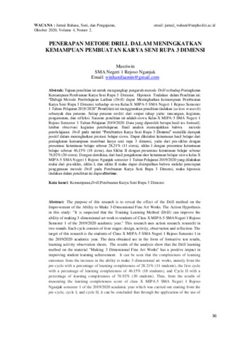 Tujuan penelitian ini untuk mengungkap pengaruh metode drill terhadap peningkatan kemampuan pembuatan karya seni rupa 3 dimensi. Hipotesis tindakan dalam penelitian ini: “Diduga metode pembelajaran latihan (drill) dapat meningkatkan kemampuan pembuatan karya seni rupa 3 dimensi terhadap siswa kelas X MIPA-5 SMA Negeri 1 Rejoso semester 1 tahun pelajaran 2019/2020”. Penelitian ini menggunakan penelitian tindakan (action research) sebanyak dua putaran. Setiap putaran terdiri dari empat tahap yaitu: rancangan, kegiatan, pengamatan, dan refleksi. Sasaran penelitian ini adalah siswa kelas X MIPA-5 SMA Negeri 1 Rejoso semester 1 tahun pelajaran 2019/2020. Data yang diperoleh berupa hasil tes formatif, lembar observasi kegiatan pembelajaran. Hasil analisis menunjukkan bahwa metode pembelajaran drill pada materi “pembuatan karya seni rupa 3 dimensi” memiliki dampak positif dalam meningkatkan prestasi belajar siswa. Dapat diketahui ketuntasan hasil belajar dari peningkatan kemampuan membuat karya seni rupa 3 dimensi, yaitu dari pra-siklus dengan presentase ketuntasan belajar sebesar 28,21% (11 siswa), siklus I dengan presentase ketuntasan belajar sebesar 46,15% (18 siswa), dan siklus II dengan presentase ketuntasan belajar sebesar 76,92% (30 siswa). Dengan demikian, dari hasil pengukuran skor ketuntasan belajar siswa kelas X MIPA-5 SMA Negeri 1 Rejoso Nganjuk semester 1 tahun pelajaran 2019/2020 yang dilakukan mulai dari pra-siklus, siklus I, dan siklus II maka dapat disimpulkan bahwa melalui penerapan penggunaan metode drill pada pembuatan karya seni rupa 3 dimensi, maka hipotesis tindakan dalam penelitian ini dapat diterima.