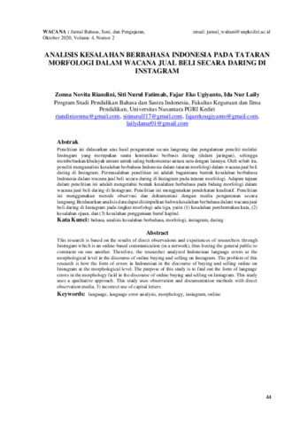 Zonna, Novita Riandini and Siti, Nurul Fatimah and Fajar, Eko Ugiyanto and Ida, Nur Laily (2020) Analisis kesalahan berbahasa Indonesia pada tataran morfologi dalam wacana jual beli secara daring di Instagram. Wacana: Jurnal Bahasa, Seni, dan Pengajaran, 4 (2): 6. pp. 44-50. ISSN 2085-2053