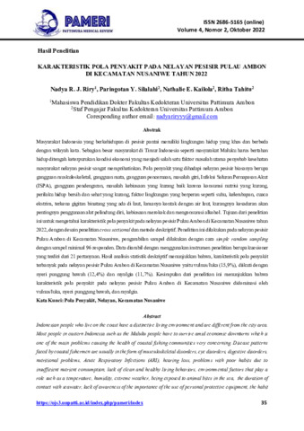 Nadya, R. J. Riry and Paringotan, Y. Silalahi and Nathalie, E. Kaiola and Ritha, Tahitu (2022) Karakteristik pola penyakit pada nelayan pesisir pulau Ambon di Kecamatan Nusaniwe tahun 2022. Pattimura Medical Review (PAMERI), 4 (2): 4. pp. 36-53. ISSN 2686-5165