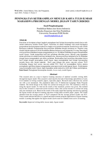 Encil, Puspitoningrum (2021) Peningkatan keterampilan menulis karya tulis ilmiah mahasiswa PBSI dengan model Jigsaw tahun 2020/2021. Wacana: Jurnal Bahasa, Seni, dan Pengajaran, 5 (1): 3. pp. 31-40. ISSN 2085-2053