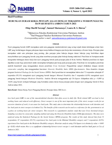 Tarangi, Filep Marfil and Maruanaya, Samuel and Huwae, Laura B. S. (2022) Hubungan durasi kerja penyapu jalan dengan terjadinya nyeri punggung bawah di Kota Ambon tahun 2021. Pattimura Medical Review (PAMERI), 4 (1): 1. pp. 1-7. ISSN 2686-5165