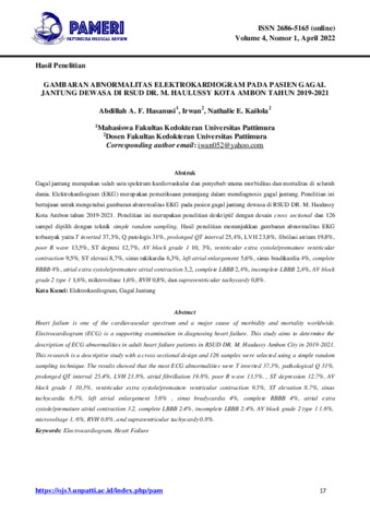 Hasanusi, Abdillah A. F. and Irwan, Irwan and Kailola, Nathalie E. (2022) Gambaran abnormalitas elektrokardiogram pada pasien gagal jantung dewasa di RSUD Dr. M. Haulussy Kota Ambon tahun 2019-2021. Pattimura Medical Review (PAMERI), 4 (1): 3. pp. 17-26. ISSN 2686-5165