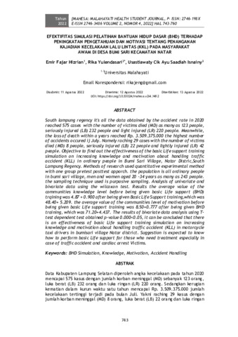 Emir, Fajar Hizrian and Rika, Yulendasari and Usastiawaty, Cik Ayu Saadiah Isnainy (2022) Efektifitas simulasi pelatihan Bantuan Hidup Dasar (BHD) terhadap peningkatan pengetahuan dan motivasi tentang penanganan Kejadian Kecelakaan Lalu Lintas (KKL) pada masyarakat awam di Desa Bumi Sari Kecamatan Natar. MAHESA: MALAHAYATI HEALTH STUDENT JOURNAL, 2 (4): 13. pp. 743-760. ISSN 2746-198X