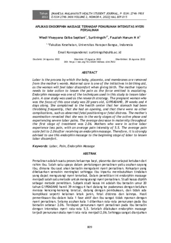 Wiedi Viseyyana Oziba, Septiani and Surtiningsih, Surtiningsih and Fauziah, Hanum N A (2022) Aplikasi endorphin massage terhadap penurunan intensitas nyeri persalinan. MAHESA: MALAHAYATI HEALTH STUDENT JOURNAL, 2 (4): 19. pp. 809-815. ISSN 2746-198X