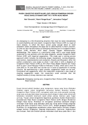 Heri, Siswanto and Resmi, Pangaribuan and Jemaulana, Tarigan (2023) Pasien Congestive Heart Failure (CHF) dengan pemberian oksigen nasal kanul di Rumah Sakit TK II Putri Hijau Medan. MAHESA: Malahayati Health Student Journal, 3 (1): 2. pp. 13-23. ISSN 2746-198X