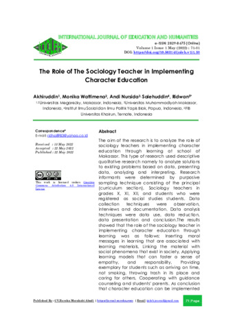 Akhiruddin, Akhiruddin and Monika, Wattimena and Andi, Nursida and Salehudin, Salehudin and Ridwan, Ridwan (2022) The role of the sociology teacher in implementing character education. International Journal of Education and Humanities, 1 (1): 7. pp. 71-81. ISSN 2830-4578