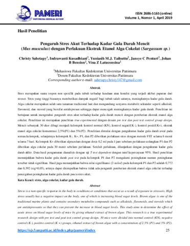 Christy, Sahetapy and Indrawanti, Kusadhiani and Yuniasih, M. J. Taihuttu and Jansye, C. Penturi and Johan, B. Bension and Vina, Z. Latuconsina (2021) Pengaruh stres akut terhadap kadar gula darah mencit (mus musculus) dengan perlakuan ekstrak etanol alga cokelat (sargassum sp.). Pattimura Medical Review (PAMERI), 3 (2): 3. pp. 25-41. ISSN 2686-5165