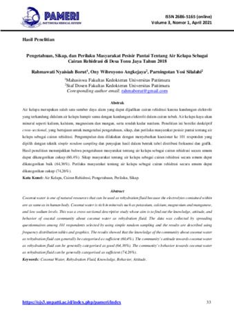Rahmawati, Nyaisiah Borut and Ony, Wibroyono Angkejaya and Parningotan, Yosi Silalahi (2021) Pengetahuan, sikap, dan perilaku masyarakat pesisir pantai tentang air kelapa sebagai cairan rehidrasi di Desa Tonu Jaya tahun 2018. Pattimura Medical Review (PAMERI), 3 (1): 3. pp. 33-45. ISSN 2686-5165