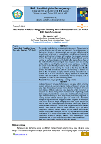 Risa, Anggraini and Ardi, Ardi (2022) Meta-analisis praktikalitas penggunaan e-learning berbasis edmodo oleh guru dan peserta didik dalam pembelajaran. Jurnal Biologi dan Pembelajarannya (JBP), 9 (2): 1. pp. 62-68. ISSN 2406-8659