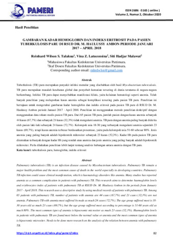 Reinhard, Wilson S. Talakua and Vina, Z. Latuconsina and Siti, Hadjar Malawat (2020) Gambaran kadar hemoglobin dan indeks eritrosit pada pasien tuberkulosis paru di RSUD Dr. M. Haulussy Ambon periode Januari 2017 – April 2018. Pattimura Medical Review (PAMERI), 2 (2): 1. pp. 82-89. ISSN 2686-5165