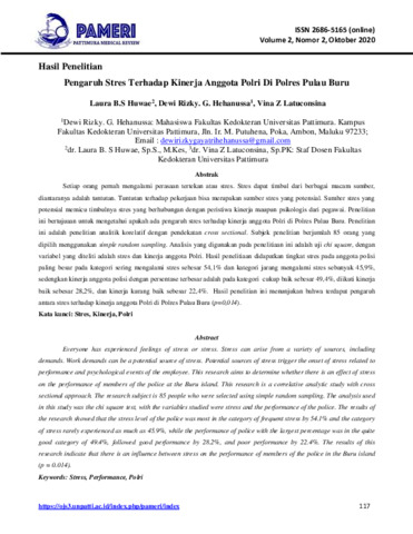 Laura, B.S. Huwae and Dewi, Rizky. G. Hehanussa and Vina, Z Latuconsina (2020) Pengaruh stres terhadap kinerja anggota polri di Polres Pulau Buru. Pattimura Medical Review (PAMERI), 2 (2): 4. pp. 117-126. ISSN 2686-5165