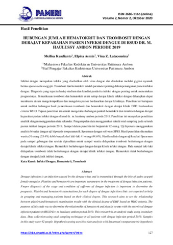 Meilisa, Kusdianto and Elpira, Asmin and Vina, Z. Latuconsina (2020) Hubungan jumlah hematokrit dan trombosit dengan derajat keparahan pasien infeksi dengue di RSUD Dr. M. Haulussy Ambon periode 2019. Pattimura Medical Review (PAMERI), 2 (2): 5. pp. 127-144. ISSN 2686-5165