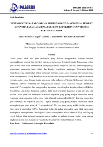 Abdur, Rahman Assagaf and Carmila, L Tamtelahitu and Halida, Rahawarin (2020) Hubungan tingkat kecanduan bermain online game dengan tingkat astenopia pada mahasiswa fakultas kedokteran Universitas Pattimura Ambon. Pattimura Medical Review (PAMERI), 2 (2): 6. pp. 145-160. ISSN 2686-5165