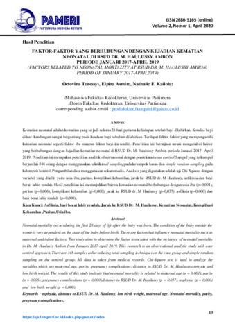 Octovina, Toressy and Elpira, Asmin and Nathalie, E. Kailola (2020) Faktor-faktor yang berhubungan dengan kejadian kematian neonatal di RSUD Dr. M. Haulussy Ambon Periode Januari 2017-April 2019. Pattimura Medical Review (PAMERI), 2 (1): 2. pp. 13-25. ISSN 2686-5165