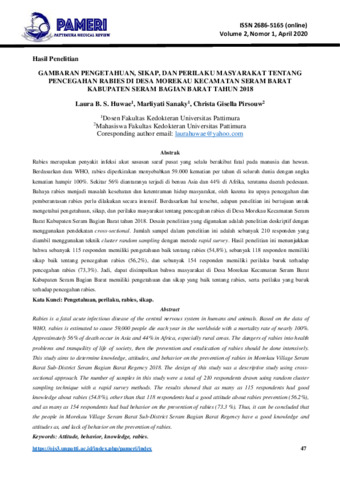 Laura, B. S. Huwae and Marliyati, Sanaky and Christa, Gisella Pirsouw (2020) Gambaran pengetahuan, sikap, dan perilaku masyarakat tentang pencegahan rabies di Desa Morekau Kecamatan Seram Barat Kabupaten Seram Bagian Barat tahun 2018. Pattimura Medical Review (PAMERI), 2 (1): 5. pp. 47-58. ISSN 2686-5165