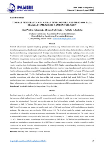 Dian, Petricia Sekeronej and Alessandra, F. Saija and Nathalie, E. Kailola (2020) Tingkat pengetahuan dan sikap tentang perilaku merokok pada remaja di SMK Negeri 3 Ambon tahun 2019. Pattimura Medical Review (PAMERI), 2 (1): 6. pp. 59-70. ISSN 2686-5165