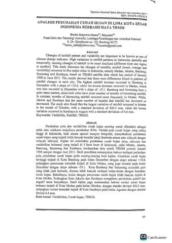 Perubahan pola dan variabilitas curah hujan penting untuk diketahui sebagai salah satu indikator terjadinya perubahan iklim, Variasi pola curah hujan yang cukup tinggi di Indonesia, baik secara spasial maupun temporal, menyebabkan perubahan curah hujan yang terjadi lebih banyak bersifat lokal (berbeda antara satu wilayah dengan wilayah lainnya). Kajian ini membahas perubahan curah hujan (tren, rata-rata dan variabilitas bulanan) yang terjadi di 5 kota besar di Indonesia, yaitu Medan, Jakarta, Bandung, Semarang dan Surabaya, berdasarkan data satelit TRMM periode Januari 1998 sampai dengan Juni 2011. Hasil penelitian menunjukkan bahwa terdapat perbedaan pola perubahan curah hujan pada masing-masing kota kajian. Kenaikan curah hujan tertinggi terjadi di Kota Bandung pada bulan Desember dengan slope sebesar +18.8 sedangkan penurunan terendah terjadi di Kota Medan, yang juga tercatat pada bulan Desember dengan slope sebesar -19.1. Kota Bandung dan Semarang memiliki pola yang tidak jauh berbeda, di mana lebih banyak terdapat bulan-bulan dengan kenaikan curah hujan. Sebaliknya, bulan dengan penurunan curah hujan lebih banyak terjadi di Kota Medan. Sedangkan Kota Jakarta dan Surabaya mengalami perubahan positif dan negatif sama banyaknya. Hasil kajian juga menemukan bahwa variasi curah hujan terbesar terjadi di Kota Medan pada bulan Oktober, dengan standar deviasi 436.5 mm sedangkan variasi terendah terjadi di Kota Surabaya pada bulan Agustus dengan standar dcviasi 6.4 mm.