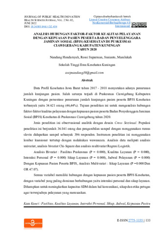 Nandang, Hendarsyah and Rosi, Suparman and Susianto, Susianto and Mamlukah, Mamlukah (2022) Analisis hubungan faktor-faktor kualitas pelayanan dengan kepuasan pasien peserta Badan Penyelenggara Jaminan Sosial (BPJS) kesehatan di Puskesmas Ciawigebang kabupaten Kuningan tahun 2020. Journal of Public Health Innovation (JPHI), 2 (2): 4. pp. 133-142. ISSN 2775-1155