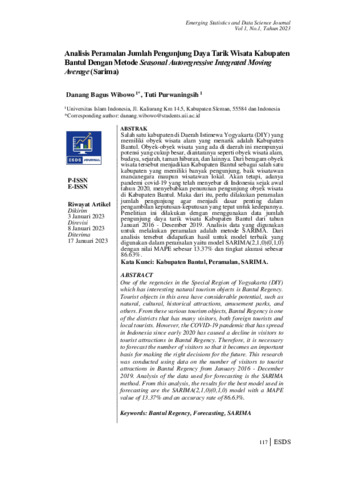 Danang, Bagus Wibowo and Tuti, Purwaningsih (2023) Analisis peramalan jumlah pengunjung daya tarik wisata Kabupaten Bantul dengan metode Seasonal Autoregressive Integrated Moving Average (SARIMA). ESDS: Emerging Statistics and Data Science Journal, 1 (1): 13. pp. 117-127. ISSN 2988-4004
