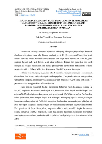 Siti Nunung, Nurjannah and Siti, Nurlela (2022) Tingkat kecemasan ibu hamil primigravida berdasarkan karakteristik dalam menghadapi kehamilan selama pandemi Covid-19 di Desa Mekarjaya Kecamatan Cimahi Kabupaten Kuningan. Journal of Public Health Innovation (JPHI), 2 (2): 6. pp. 151-158. ISSN 2775-1155