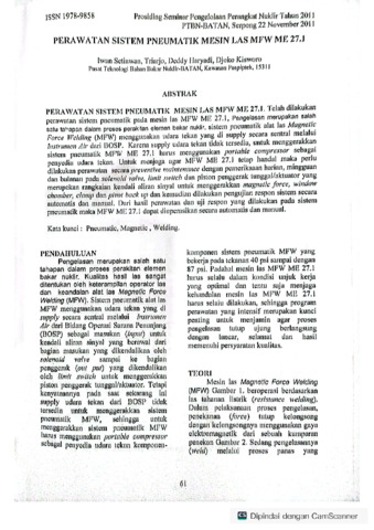 Telah dilakukan perawatan sistem pneumatik pada mesin las MFW ME 27,1. Pengelasan merupakan salah satu tahapan dalam proses perakitan elemen bakar nuklir, sistem pneumatik alat las magnetic force welding (MFW) menggunakan udara tekan uang disupply secara sentral melalui instrumen air dari BOSP, karena supply udara tekan tidak tersedia, untuk menggerakkan sistem pneumatik MFW ME 27,1 harus menggunakan portable compressor sebagai penyedia udara tekan. Untuk menjaga agar MFW ME 27,1 tetap handal maka perlu dilakukan perawatan secara preventive maintenance dengan pemeriksaan harian, mingguan dan bulanan pada solenoid valve, limit switch piston penggerak tunggal/ aktuator yang merupakan rangkaian kendali aliran sinyal untuk menggerakkan magnetic force, window chamber, clamp dan pivot back up dan kemudian dilakukan pengujian respon sistem secara automatis dan manual. Dari hasil perawatan dan uji respon yang dilakukan pada sistem pneumatik maka MFW ME 27,1 dapat dioperasikan secara automatis dan manual.