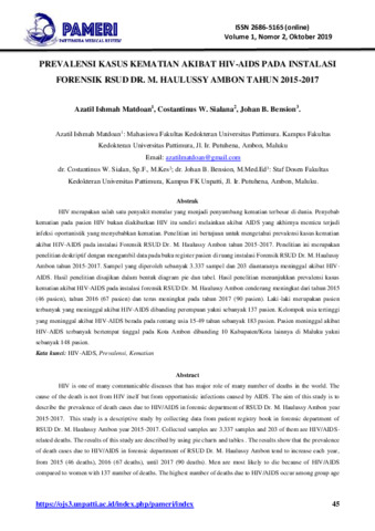Azatil, Ishmah Matdoan and Costantinus, W. Sialana and Johan, B. Bension (2019) Prevalensi kasus kematian akibat hiv-aids pada instalasi forensik RSUD Dr. M. Haulussy Ambon tahun 2015-2017. Pattimura Medical Review (PAMERI), 1 (2): 4. pp. 45-52. ISSN 2686-5165