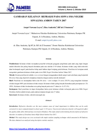Ampri, Yuwana Loyra and Elna, Anakotta and Rif`ah, Z. Soumena (2019) Gambaran kelainan refraksi pada siswa SMA Negeri Siwalima Ambon tahun 2017. Pattimura Medical Review (PAMERI), 1 (2): 7. pp. 81-91. ISSN 2686-5165