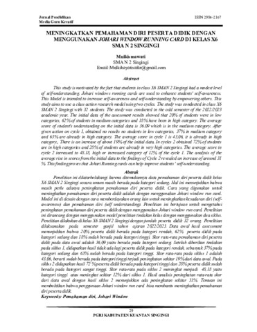 Mulkismawati, Mulkismawati (2023) Meningkatkan pemahaman diri peserta didik dengan menggunakan Johari window running card di kelas X6 SMAN 2 Singingi. Jurnal Pendidikan Media Guru Kreatif, 1 (1): 3. pp. 29-41. ISSN 2986-2167
