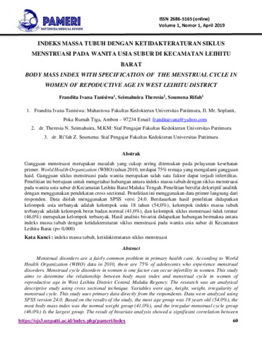 Frandita, Ivana Tanisiwa and Seimahuira, Theresia and Soumena, Rifah (2019) Indeks massa tubuh dengan ketidakteraturan siklus menstruasi pada wanita usia subur di Kecamatan Leihitu Barat. Pattimura Medical Review (PAMERI), 1 (1): 7. pp. 60-71. ISSN 2686-5165