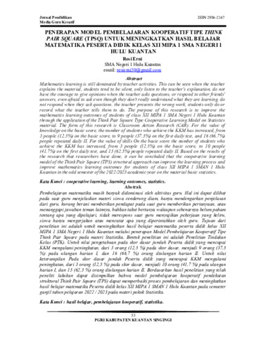 Erni, Resi (2023) Penerapan model pembelajaran kooperatif tipe Think Pair Square (TPSQ) untuk meningkatkan hasil belajar matematika peserta didik kelas XII MIPA 1 SMA Negeri 1 Hulu Kuantan. Jurnal Pendidikan Media Guru Kreatif, 1 (1): 5. pp. 53-66. ISSN 2986-2167