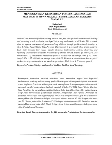 Helmaheri, Helmaheri (2023) Meningkatkan kemampuan pemecahan masalah matematis siswa melalui pembelajaran berbasis masalah. Jurnal Pendidikan Media Guru Kreatif, 1 (1): 7. pp. 77-88. ISSN 2986-2167