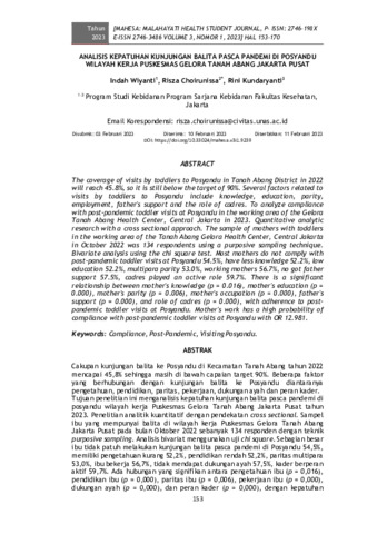 Indah, Wiyanti and Risza, Choirunissa and Rini, Kundaryanti (2023) Analisis kepatuhan kunjungan balita pasca pandemi di Posyandu Wilayah Kerja Puskesmas Gelora Tanah Abang Jakarta Pusat. MAHESA: MALAHAYATI HEALTH STUDENT JOURNAL, 3 (1): 14. pp. 153-170. ISSN 2746-198X