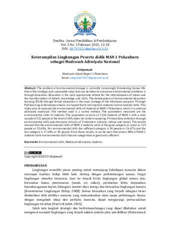 Istiqomah, Istiqomah (2023) Keterampilan lingkungan peserta didik MAN 1 Pekanbaru sebagai Madrasah Adiwiyata Nasional. Dealika : Jurnal Pendidikan & Pembelajaran, 1 (1): 2. pp. 12-20. ISSN 2986-1322