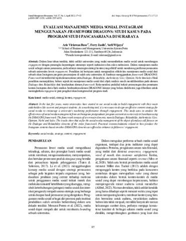 Ruse, Arie Viriawan and Jaolis, Ferry and Wijaya, Serli (2023) Evaluasi manajemen media sosial instagram menggunakan framework dragons: studi kasus pada program studi pascasarjana di Surabaya. Jurnal Manajemen Pemasaran, 17 (1): 3. pp. 17-23. ISSN 1907-235X