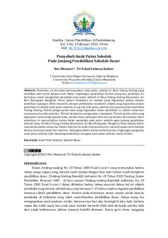Dwi, Mutiansi and Tri, Fahad Lukman Hakim (2023) Penyebab anak putus sekolah pada jenjang pendidikan Sekolah Dasar. Dealika : Jurnal Pendidikan & Pembelajaran, 1 (1): 7. pp. 59-66. ISSN 2986-1322
