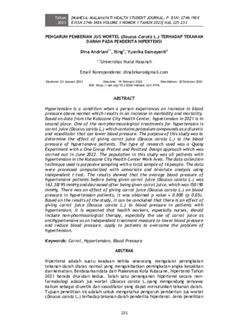 Dina, Andriani and Iting, Iting and Yusnika, Damayanti (2023) Pengaruh pemberian jus wortel (Daucus carota L.) terhadap tekanan darah pada penderita hipertensi. MAHESA: MALAHAYATI HEALTH STUDENT JOURNAL, 3 (1): 20. pp. 225-233. ISSN 2746-198X