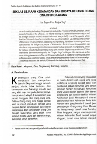 Ida, Bagus Putu Prajna Yogi (2008) Sekilas sejarah kedatangan dan budaya keramik orang Cina di Singkawang. Naditira Widya, 2 (1): 4. pp. 32-44. ISSN 1410 - 0932