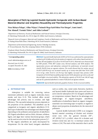 Neza Rahayu, Palapa and Alfan, Wijaya and Patimah Mega Syah Bahar Nur, Siregar and Amri, Amri and Nur, Ahmad and Tarmizi, Taher and Aldes, Lesbani (2023) Adsorption of Fe (II) by layered double hydroxide composite with carbon-based material (Biochar and Graphite): reusability and thermodynamic properties. Indonesian Journal of Chemistry (Indones. J. Chem), 23 (1): 10. pp. 101-112. ISSN 1411-9420